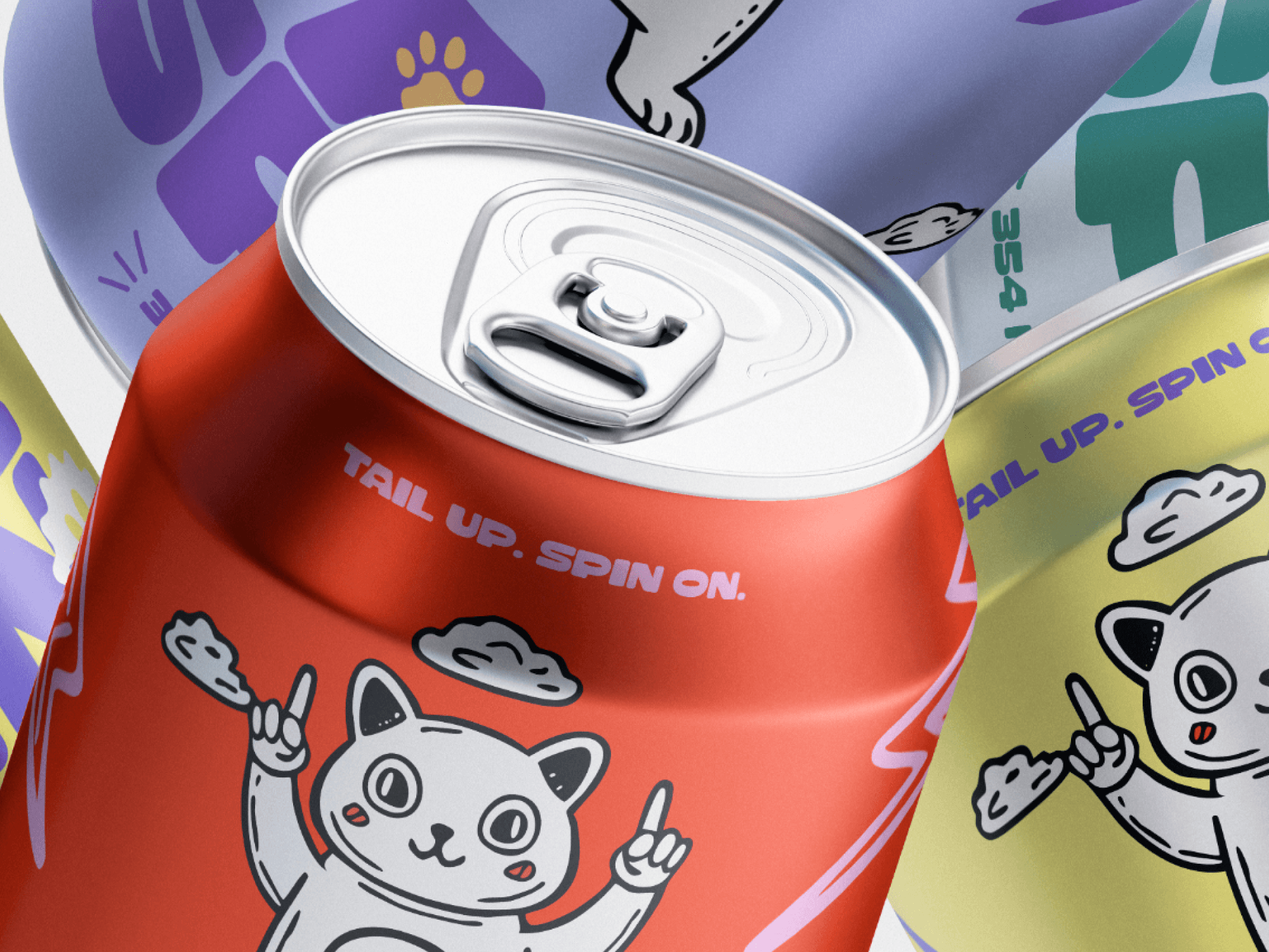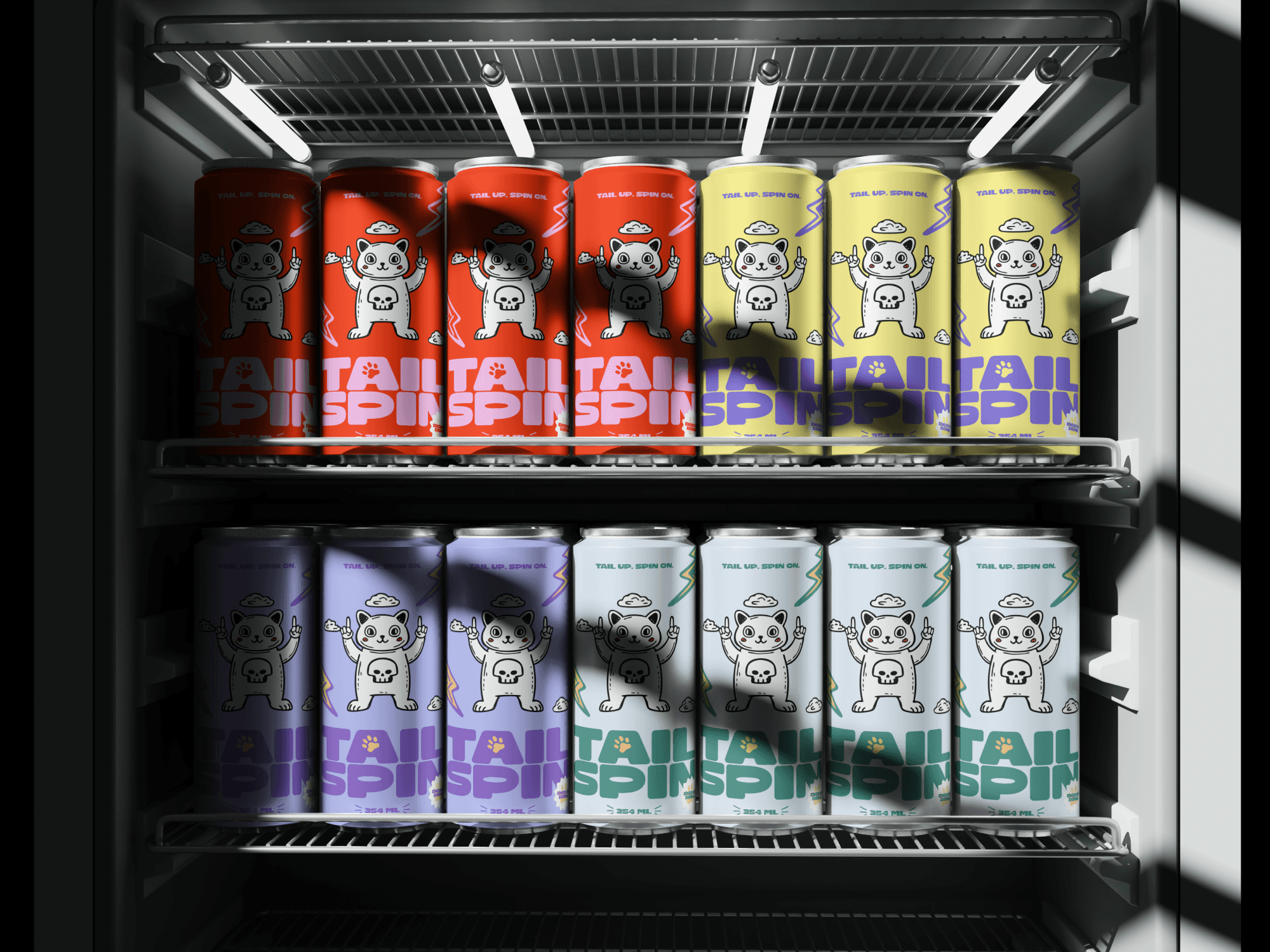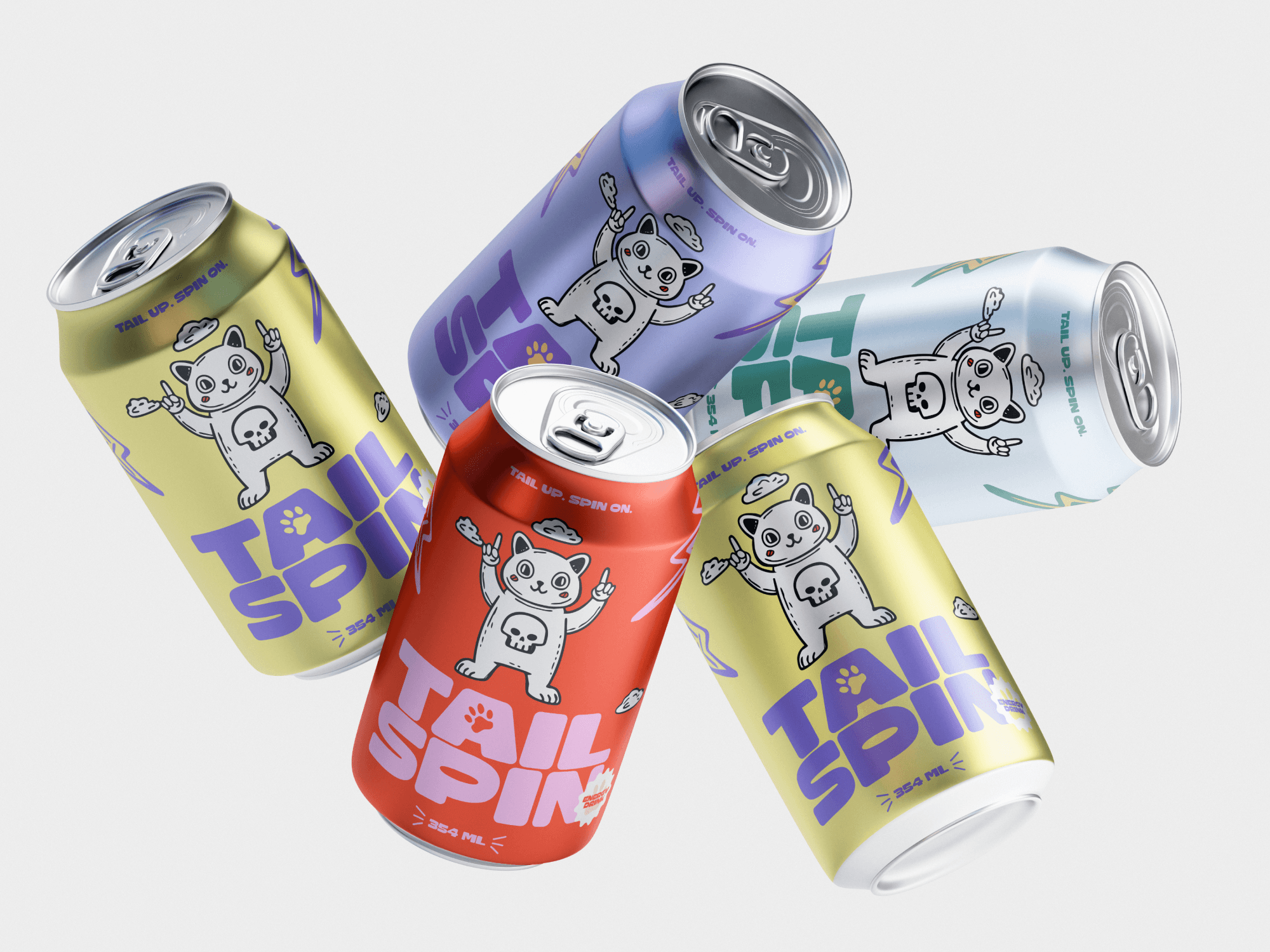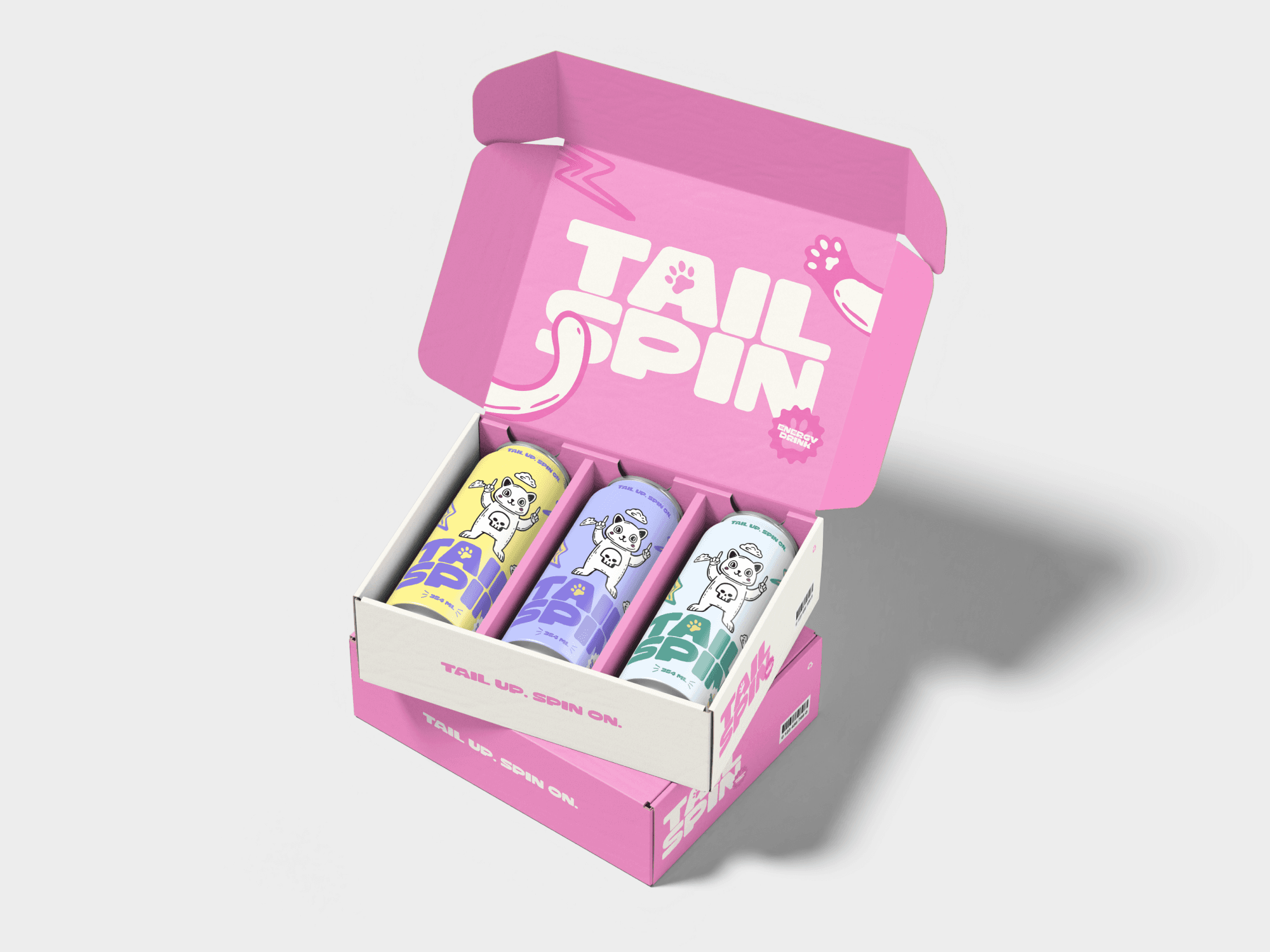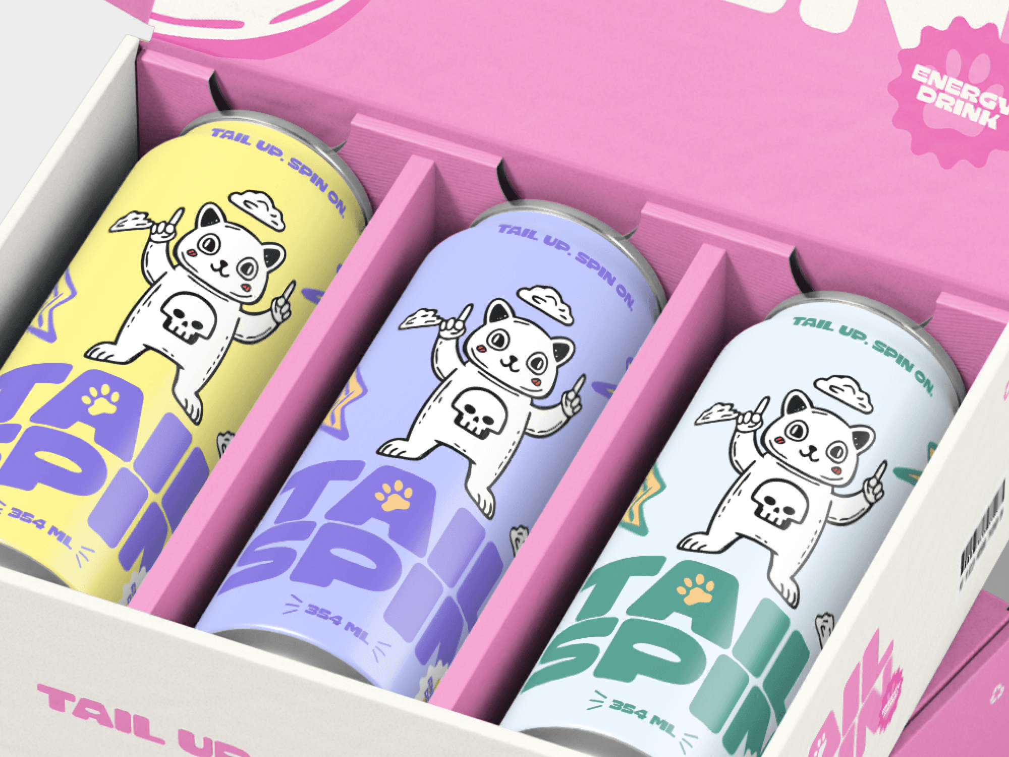 TailSpin’s distinctive energy drink branding, featuring a playful cat mascot, stands out from other brands and grabs attention, ensuring people notice it in the market.